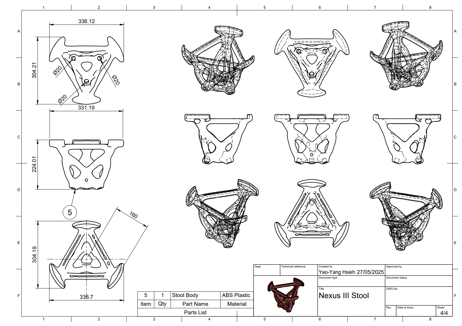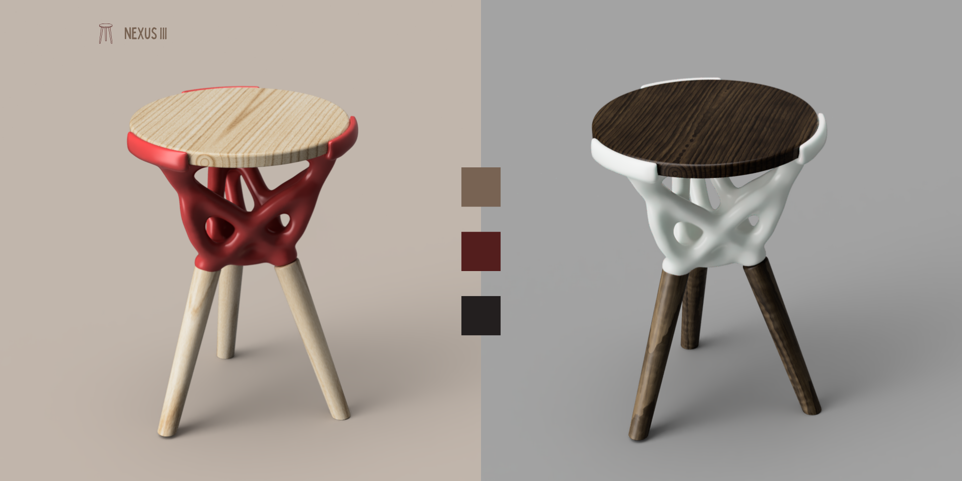 Nexus III is a generative furniture prototype exploring how computational rules can inform physical design. Through parametric modelling and digital fabrication, the project translates algorithmic logic into a structurally balanced stool shaped by material and fabrication constraints.